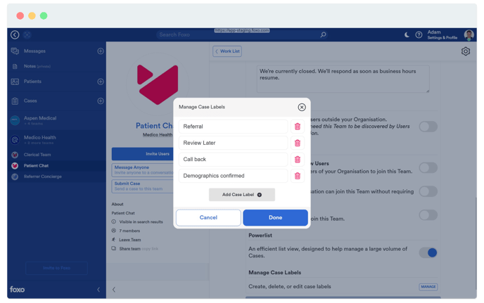To add a label, click Add Case Label, enter the label name